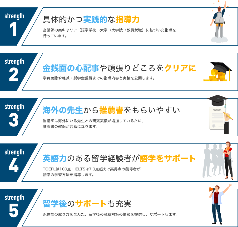 英語UPや学費免除獲得の方法など体型的にまなべ、何か質問が出た時にいつでも岩月先生に聞け、就職する方法までも教えてくれるので、高いモチベーションが保てています!大学院の学べる違いまで熟知していて、自分の興味で学校を選べます。